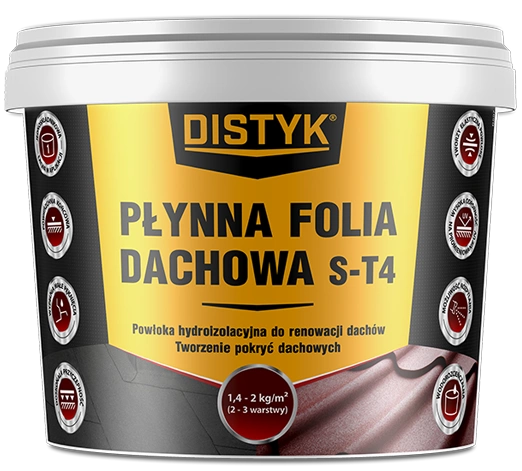 - Folia w Płynie powłoka hydroizolacyjna do pokryć dachowych . Nadaje się do podłoży z betonu, asfaltowych pokryć dachowych, podłoży z blachy i azbestów . 30kg (ok. 21,42 m2) . Minimalnie na dwie warstwy 1,4 kg. Symbol: S-T4