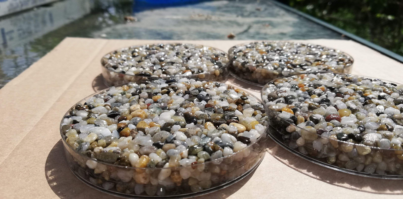 Kamień to Żwirek naturalny "szary" frakcja 3-5 oraz najmocniejsze spoiwo do kamiennego dywanu czyli żywica epoksydowa.