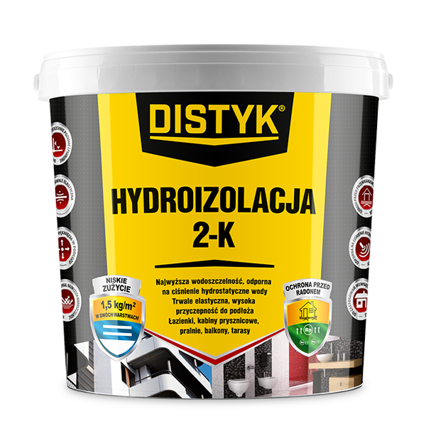 - Zestaw z gruntem i hydroizolacją dwuskładnikową DISTYK 2-K do zastosowania na mało obciążone powierzchnie tylko dla ruchu pieszego na przykład: hydroizolacja na balkon, taras.