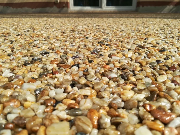 Komplet z Gruntem i Hydroizolacją dwuskładnikową na Kamienny dywan na 10 m2 na wysokość 12 mm z naturalnego kolorowego żwirku brązowo/miodowego i do tego Żywica Epoksydowa, spoiwo do kamienia.
