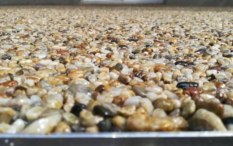 Komplet z Gruntem i Hydroizolacją dwuskładnikową na Kamienny dywan na 1 m2 na wysokość 10 mm z naturalnego kolorowego żwirku brązowo/miodowego i do tego Żywica Epoksydowa, spoiwo do kamienia.