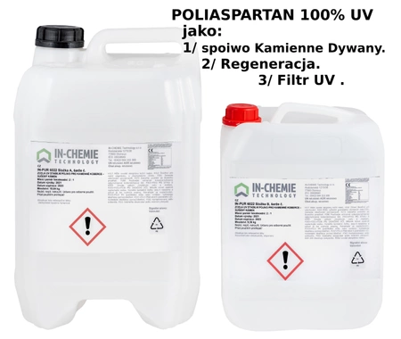 100% UV żywica IN-PUR 6022 LONG - unikalne dwuskładnikowe spoiwo, idealne zarówno do tworzenia efektownych Kamiennych Dywanów, jak i do regeneracji już istniejących powierzchni. Zaawansowana formuła żywicy poliaspartanowej zapewnia znacząco wydłużony czas urabialności, przewyższając nawet tradycyjną żywicę epoksydową, a co dopiero poliuretanową.